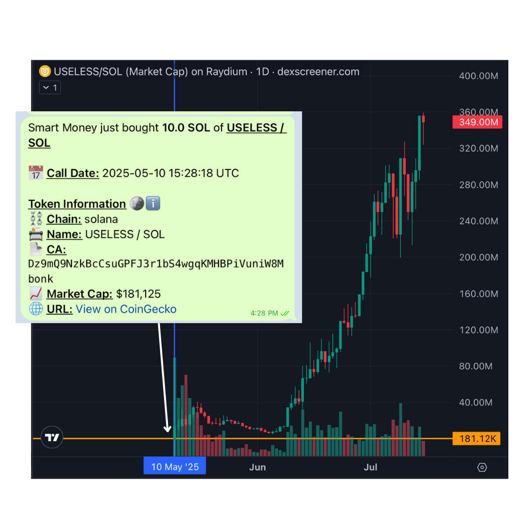 Our custom scanner watches Solana in real time and cross-checks every transaction against 150 hand-curated smart-money wallets (VC treasuries, prolific dev multisigs, serial meme-coin winners). When any of those wallets deploy a contract, add liquidity, or sweep tokens, the bot fires a ping.How fast are these pings compared with Twitter or DexTools?